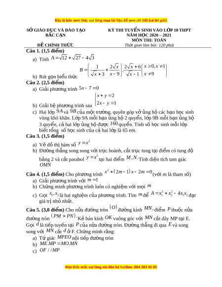 Đề thi vào 10 môn Toán tỉnh Bắc Cạn (Hệ không chuyên) năm 2021
