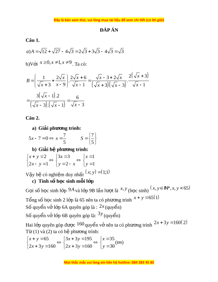 x 3. x 1 x 3 Câu 2. a) Giải phư ng t ơ rình: 7 7 5x 7 0 x S 5 5 b) Giải h p ệ hư ng t ơ rình: x y 2 3 x 3 x 1 2x y 1 y 2 x y 1 V y ậ h có nghi ệ m ệ duy nh t ấ ; x y 1; 1 c) Tính s h ố c ọ sinh m i ỗ l p ớ G i ọ số h c s ọ inh l p ớ 9A và l p 9B ớ lần lư t