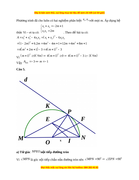 A x x 4x x 1 2 là hai nghi m ệ c a ph ủ ư ng ơ trình. Tìm m đ ể 1 2 1 2 đ t ạ giá trị nh nh ỏ ất. Câu 5. (3,0 đi m ể ) Cho n a ử đư ng t ờ ròn O đư ng ờ kính MN, đi m ể P thu c n ộ a ử đư ng