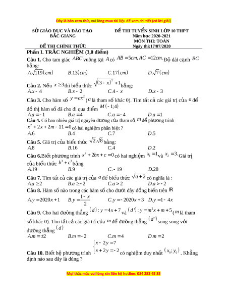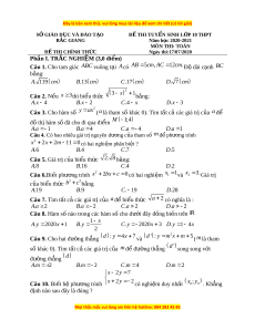 SỞ GIÁO D C Ụ VÀ ĐÀO T O Ạ Đ Ề THI TUY N Ể SINH L P Ớ 10 THPT B C Ắ GIANG Năm h c ọ 2020-2021 MÔN THI: TOÁN Đ Ề THI CHÍNH TH C Ứ Ngày thi:17/07/2020 Phần I. TR C Ắ NGHI M Ệ (3,0 đi m ể )