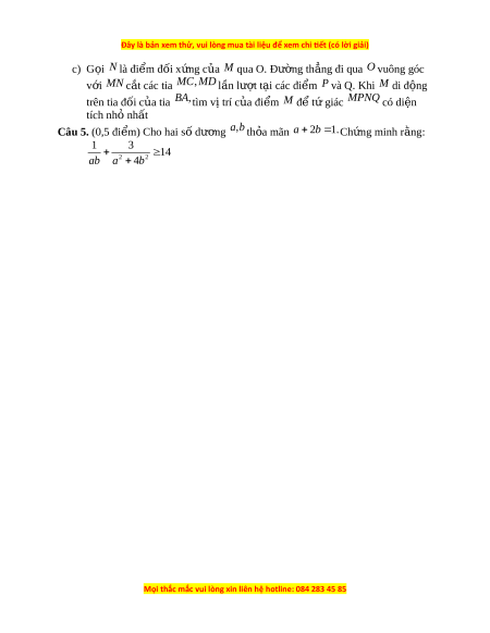 ứ ác MPNQ có diện tích nhỏ nhất Câu 5. (0,5 đi m ể ) Cho hai s d ố ư ng ơ a,b th a m ỏ ãn a 2b 1. Ch ng ứ minh r ng: ằ 1 3 1 4 2 2 ab a 4b