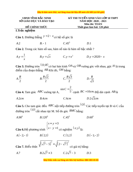 Đề thi vào 10 môn Toán tỉnh Bắc Ninh (Hệ không chuyên) năm 2021