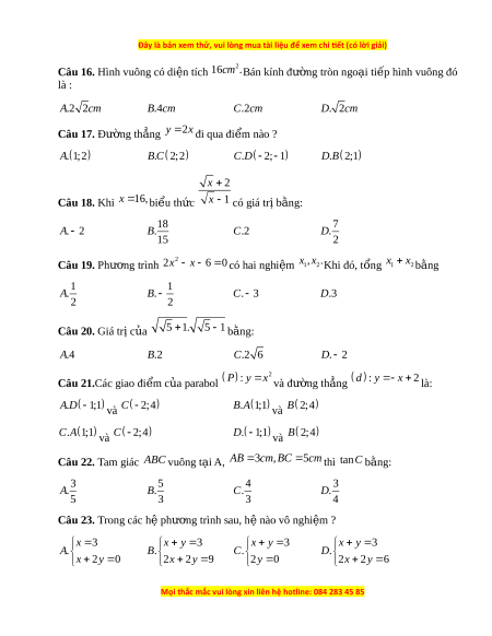 16cm .Bán kính đư ng ờ tròn ngo i ạ ti p ế hình vuông đó là : .2 A 2cm .4 B cm C.2cm . D 2cm Câu 17. Đư ng ờ th ng ẳ y 2 x đi qua đi m ể nào ? . A 1;2 . B C 2;2