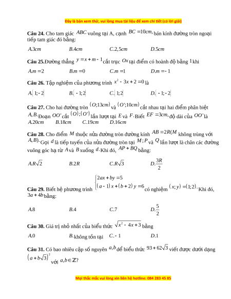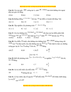Câu 24. Cho tam giác ABC vuông t i ạ A, c nh ạ BC 1 0c , m bán kính đư ng t ờ ròn ngo i ạ ti p t ế am giác đó b ng: ằ . A 3cm . B 4cm C.2,5cm . D 5cm Câu 25.Đư ng ờ th ng ẳ