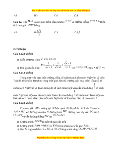 có hai nghiệm x , x . x x 1 2 Khi đó, tổng 1 2 b ng ằ 1 1 . A . B C. 3 .3 D 2 2 Câu 20. Giá tr c ị a ủ 5 1. 5 1 b ng: ằ .4 A .2 B C.2 6 . D 2 Câu 21.Các giao đi m ể c a ủ parabol P 2