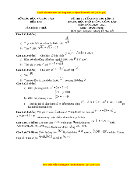 Đề thi vào 10 môn Toán tỉnh Bến Tre (Hệ không chuyên) năm 2021