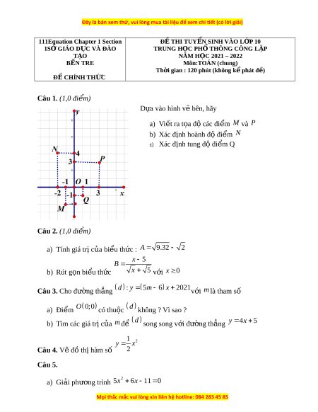 NĂM HỌC 2021 – 2022 B N Ế TRE Môn:TOÁN (chung) Th i
