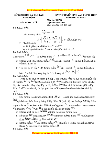 SỞ GIÁO D C Ụ VÀ ĐÀO T O Ạ KỲ THI TUY N Ể SINH VÀO L P Ớ 10 THPT BÌNH Đ N Ị H NĂM H C Ọ 2020-2021 Môn thi: TOÁN Đ C Ề HÍNH TH C Ứ Ngày thi: 18/7/2020 Th i