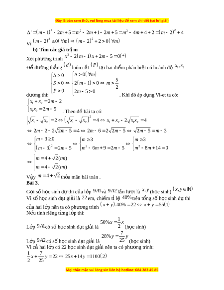 2m 5 2m 5 m 3 m 3 0 m 3 m 3 m 3 2 2 2 2 m 5 m 6m 9 2 m 5 m 8m 14 0 m 4 2(tm) m 4 2(tm) V y ậ m 4 2 th a m ỏ ãn bài toán . Bài 3. G i ọ số h c s ọ inh d t ự hi c a l ủ p ớ 9 1 A và 9 2 A lần lư t