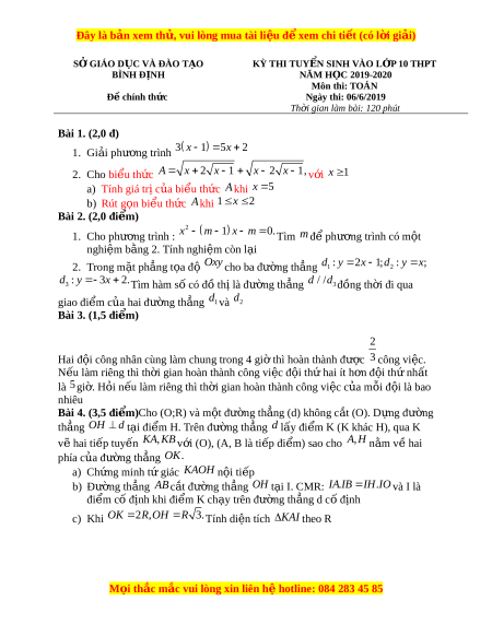 ệ xem ể chi ti t ế (có l i ờ gi i ả ) SỞ GIÁO D C Ụ VÀ ĐÀO T O Ạ KỲ THI TUY N Ể SINH VÀO L P Ớ 10 THPT BÌNH Đ N Ị H NĂM H C Ọ 2019-2020 Môn thi: TOÁN Đ c ề hính th c ứ Ngày thi: 06/6/2019 Th i