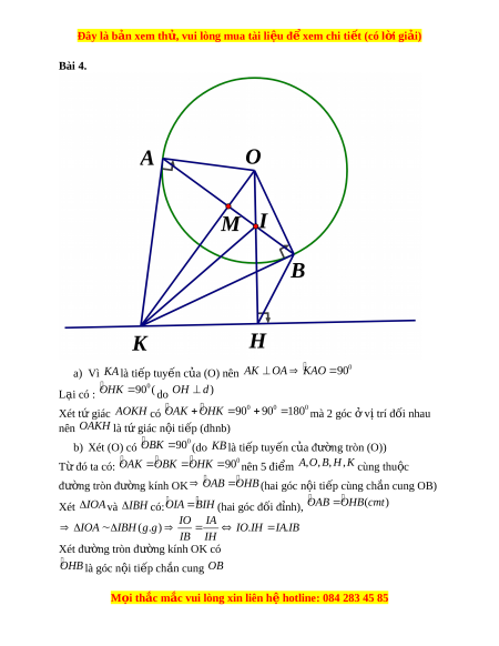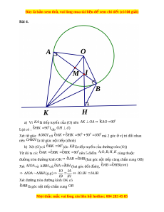 ờ gian hoàn thành công vi c c ệ a m ủ i ỗ đ i ộ là bao nhiêu Bài 4. (3,5 đi m ể )Cho (O;R) và m t ộ đư ng t ờ h ng ( ẳ d) không c t ắ (O). D ng ự đư ng ờ th ng ẳ OH d t i ạ đi m ể H. Trên đư ng t ờ h ng ẳ d lấy đi m ể K (K khác H), qua K vẽ hai ti p t ế uy n ế K , A KB v i ớ (O), (A, B là ti p đi ế m ể ) sao cho , A H n m ằ v hai ề phía c a ủ đư ng t ờ h ng ẳ OK. a) Ch ng ứ minh t gi ứ ác KAOH n i ộ ti p ế b) Đư ng ờ th ng ẳ AB c t ắ đư ng t ờ h ng ẳ OH t i ạ I. CMR: .