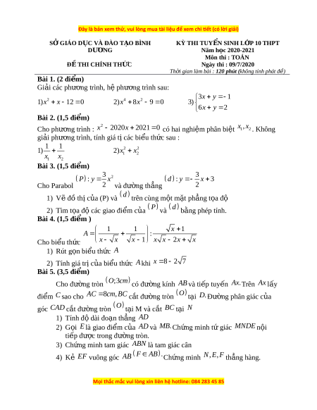 SỞ GIÁO D C Ụ VÀ ĐÀO T O Ạ BÌNH KỲ THI TUY N Ể SINH L P Ớ 10 THPT DƯ N Ơ G Năm h c ọ 2020-2021 Môn thi : TOÁN Đ Ề THI CHÍNH TH C Ứ Ngày thi : 09/7/2020 Th i