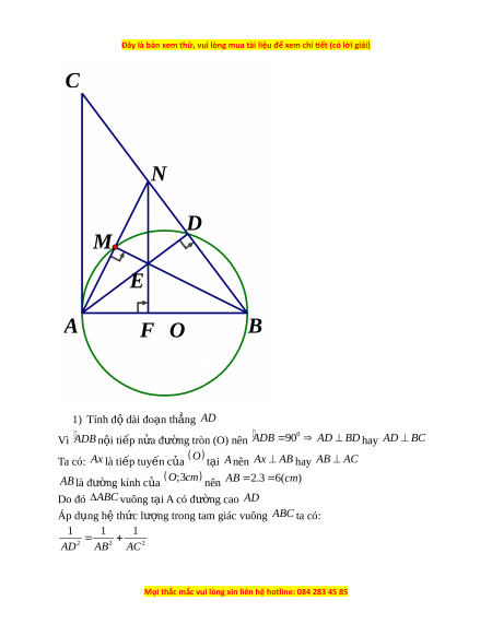 ể C sao cho AC 8 c , m BC c t ắ đư ng t ờ ròn O t i ạ . D Đư ng ờ phân giác c a ủ góc CAD c t ắ đư ng t ờ ròn O t i ạ M và c t ắ BC t i ạ N 1) Tính đ dài ộ đo n ạ th ng ẳ AD 2) G i ọ E là giao đi m ể c a ủ AD và M . B Ch ng ứ minh t gi ứ ác MNDE n i ộ ti p đ ế ư c ợ trong đư ng ờ tròn. 3) Ch ng