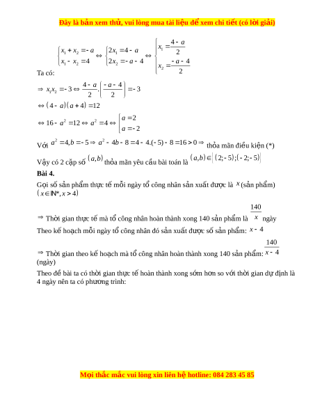 ( a,b là tham số) Tìm các giá tr c ị a ủ tham s ố a,b đ ph ể ư ng ơ trình trên có hai nghi m ệ phân bi t ệ x , x 1 2 th a ỏ x x 4 1 2 3 3 mãn đi u ki ề n : ệ x x 28 1 2 Bài 4. (1,5 đi m ể ) M t ộ tổ công nhân theo k ho ế ch ạ ph i ả làm 140 s n ph ả m ẩ trong m t ộ th i ờ gian nh t ấ đ nh. N ị h ng khi ư th c hi ự n năng s ệ u t ấ c a ủ t đã ổ vư t ợ năng su t ấ d đ ự nh l ị à 4 s n ph ả ẩm m i