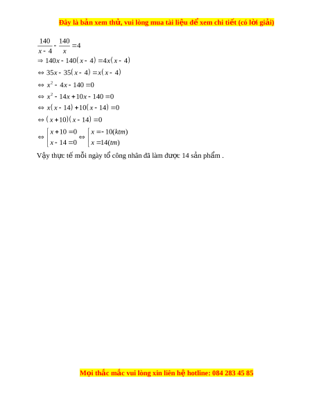 ạ mỗi ngày tổ công nhân đó s n xu ả t ấ đư c ợ s s ố n ả ph m ẩ : x 4 140 Th i ờ gian theo k ho ế ch ạ mà t công nhân hoàn t ổ hành xong 140 s n ph ả m ẩ : x 4 (ngày) Theo đ bài ề ta có th i ờ gian th c t ự hoàn t ế hành xong s m ớ h n s ơ o v i ớ th i ờ gian d đ ự nh l ị à 4 ngày nên ta có phư ng t ơ rình: M i