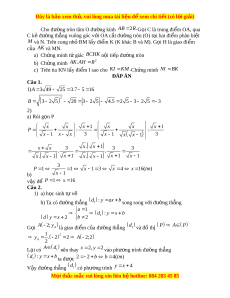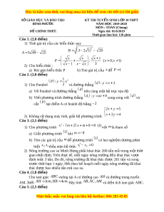 ờ gian làm bài: 120 phút Câu 1. (2,0 đi m ể ) 1) Tính giá tr c ị a ủ các bi u t ể h c s ứ au: B A 3 2 3 2 5 20 49 25 x x x 1 P : (x 0; x 1 ) x 1 x x 3 2) Cho bi u t ể h c : ứ a) Rút g n bi ọ u t ể h c P ứ b) Tìm giá tr c ị a ủ x đ ể P 1 Câu 2. (2,0 đi m ể ) 1 P 2 : y x 1) Cho Parabol 2 và đư ng t ờ h ng