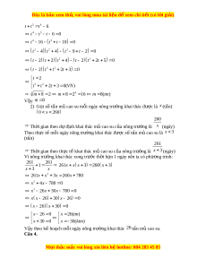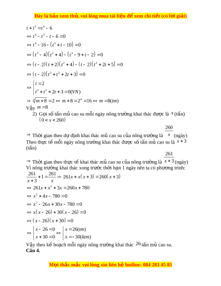 t t 2t 3 0( VN ) 4 4 m 8 2 m 8 2 16 m 8 (tm) V y ậ m 8 2) G i ọ số tấn m cao ủ su mỗi ngày nông trư ng ờ khai thác đư c ợ là x (tấn) 0 x 260 260 Th i ờ gian theo d đ ự nh khai ị thác m cao ủ su c a ủ nông trư ng ờ là x (ngày) Theo th c t ự m ế ỗi ngày nông trư ng ờ khai thác đư c ợ s t ố n m ấ cao s ủ u là x 3 (tấn) 261 Th i ờ gian theo th c t ự khai ế thác m cao s ủ u c a nông t ủ rư ng l ờ à x 3 (ngày) Vì nông trư ng khai ờ thác xong trư c ớ th i ờ h n 1 ngày nên ạ ta có phư ng t ơ rình: 261 261 1