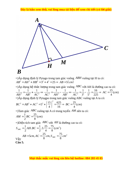 m Hãy tính AB, AC, AM và diện tích tam giác ABC. Câu 5. (2,5 đi m ể ) M i
