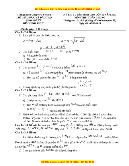 111Equation Chapter 1 Section KỲ THI TUY N Ể SINH VÀO L P Ớ 10 NĂM 2021 1SỞ GIÁO D C Ụ VÀ ĐÀO T O Ạ MÔN THI : TOÁN CHUNG BÌNH PHƯ C Ớ Th i