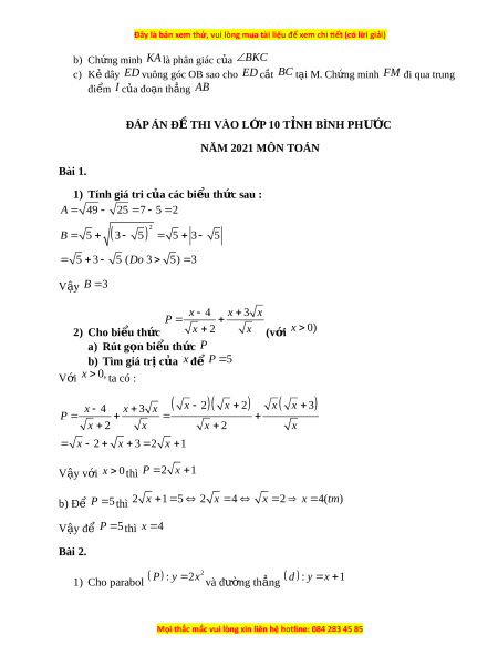 I của đoạn thẳng AB ĐÁP ÁN Đ Ề THI VÀO L P Ớ 10 T N Ỉ H BÌNH PHƯ C Ớ NĂM 2021 MÔN TOÁN Bài 1.