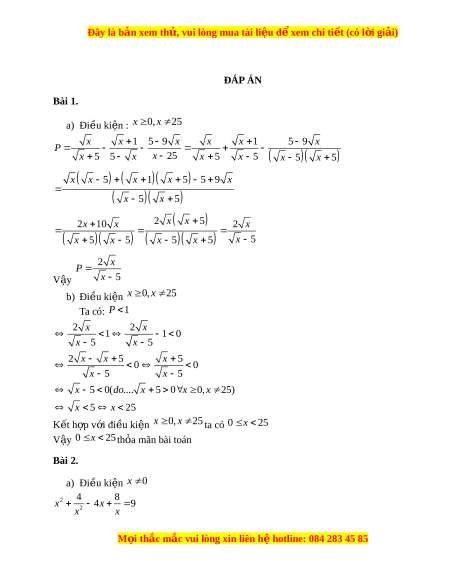 ệ xem ể chi ti t ế (có l i ờ gi i ả ) ĐÁP ÁN Bài 1. a) Đi u ki ề ện : x 0 , x 2 5 x x 1 5 9 x x x 1 5 9 x P x 5 5 x x 25 x 5