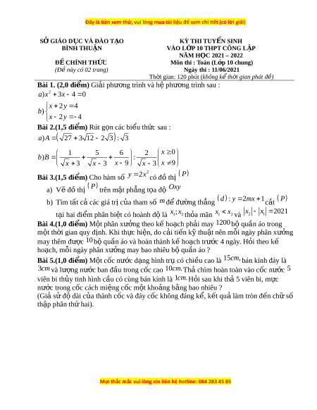 Đề thi vào 10 môn Toán tỉnh Bình Thuận năm 2022