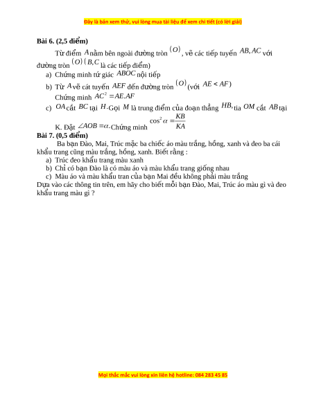 ẳ HB, tia OM c t ắ AB t i ạ KB 2 cos K. Đ t ặ AO B . Ch ng m ứ inh KA Bài 7. (0,5 đi m ể ) Ba b n Đ ạ ào, Mai, Trúc m c ặ ba chi c áo m ế àu tr ng, h ắ ng, xanh và đeo ồ ba cái khẩu trang cũng màu tr ng, ắ h ng, xanh. B ồ i t ế r ng : ằ