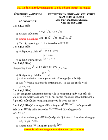 ệ xem ể chi ti t ế (có l i ờ gi i ả ) SỞ GIÁO D C Ụ VÀ ĐÀO T O Ạ KỲ THI TUY N Ể SINH VÀO L P Ớ 10 THPT CÀ MAU NĂM H C Ọ : 2019-2020