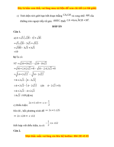 ệ xem ể chi ti t ế (có l i ờ gi i ả ) c) Tính di n t ệ ích gi i ớ h n b ạ i ở đo n ạ th ng ẳ C , A CH và cung nh ỏ AH c a ủ 0 đư ng ờ tròn ngo i ạ ti p ế t gi ứ ác AHEC.Bi t ế CA 6 cm, ACB 30 . ĐÁP ÁN Câu 1.