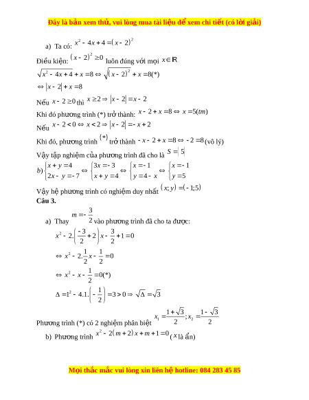 ơ trình đã cho là S 5 x y 4 3 x 3 x 1 x 1 b) 2x y 7 x y 4 y 4 x y 5 V y ậ h ph ệ ư ng t ơ rình có nghi m ệ duy nh t ấ ; x y 1;5 Câu 3. 3 m a) Thay 2 vào phư ng t ơ rình đã cho ta đư c: ợ 2 3 3 x 2. 2 x 1 0 2 2 1 1 2