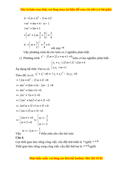 rình x 2 m 2 x m 1 0 ( x là ẩn) 3 m a) Gi i ả phư ng t ơ rình khi 2 b) Ch ng ứ minh r ng ph ằ ư ng t ơ rình luôn có hai nghi m ệ phân bi t ệ c) G i ọ x ; x 1 2 là hai nghi m ệ c a ph ủ ư ng ơ trình. Tìm các giá tr c ị a ủ m để 2 2 x x 8 1 2 Câu 4. (1,5 đi m ể ) Hai đ i ộ công nhân cùng làm m t ộ công vi c t ệ hì xong trong 4 gi . N ờ u m ế i ỗ đ i ộ làm riêng xong đư c ợ công vi c ệ y ấ , thì đ i ộ th hai ứ c n nhi ầ u h ề n ơ đ i ộ th nh ứ t ấ là 6gi . H ờ i ỏ mỗi đ i