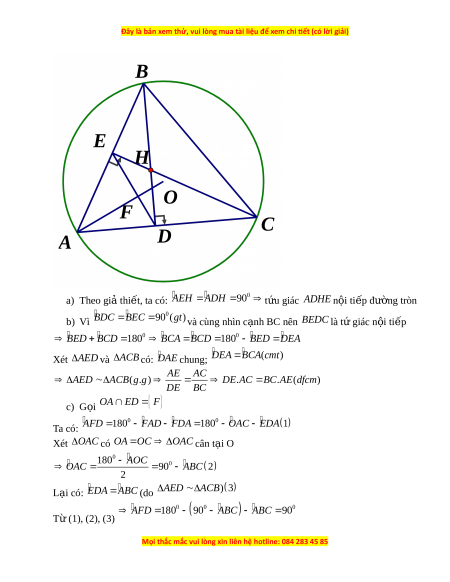 Câu 1.Cho tam giác ABC có các góc đ u nh ề n. ọ Vẽ các đư ng cao ờ BD,CE c a t ủ am giác ABC.G i ọ H là giao đi m ể c a ủ BD,CE a) Ch ng ứ minh t gi ứ ác ADHE n i ộ ti p đ ế ược đư ng t ờ ròn b) Ch ng ứ minh r ng: ằ DE.AC BC .AE c) G i ọ O là tâm đư ng t ờ ròn ngo i ạ ti p t ế am giác ABC.Ch ng ứ minh r ng ằ OA DE Câu 2. Tàu ng m ầ đang t ở rên m t ặ bi n b ể ng đ ỗ t ộ ng t ộ l n ặ xu ng t ố heo phư ng ơ t o ạ v i ớ m t ặ nư c bi ớ n m ể t ộ góc 0 20 a) N u ế tàu chuy n đ ể ng t ộ heo phư ng ơ l n xu ặ ng ố 400m thì nó đ ở s ộ âu bao nhiêu mét b) Tàu ph i ả ch y bao nhi ạ êu mét đ đ ể t ạ đ n đ ế s ộ âu 1000m? (Lầm tròn k t ế quả đ n m ế ét)