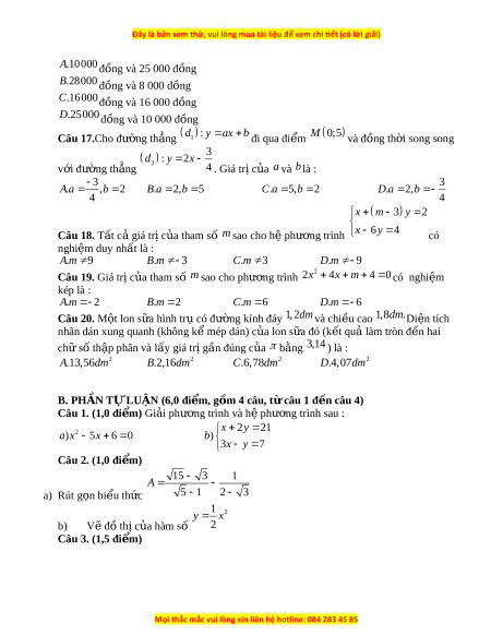 D 25000 đồng và 10 000 đồng Câu 17.Cho đư ng t ờ h ng ẳ d : y a x b M 0;5 1 đi qua đi m ể và đồng th i ờ song song 3 d : y 2 x 2 v i ớ đư ng ờ th ng ẳ 4 . Giá tr c ị a