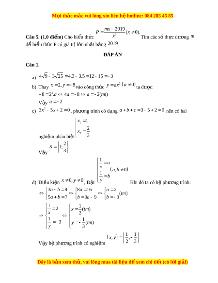 ọ thắc mắc vui lòng xin liên hệ hotline: 084 283 45 85 mx 2019 P (x 0) . Câu 5. (1,0 đi m ể ) Cho bi u t ể h c ứ 2 x Tìm các số th c d ự ư ng ơ m đ bi ể u ể th c ứ P có giá tr l ị n nh ớ t ấ b ng ằ 2019 ĐÁP ÁN Câu 1. a) 4 9 3 25 4 .3 3.5 1 2 15 3 2 b) Thay x 2