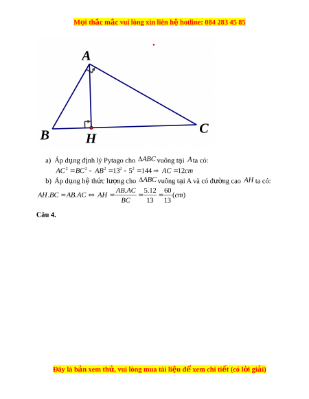 ọ thắc mắc vui lòng xin liên hệ hotline: 084 283 45 85 a) Áp d ng ụ đ nh l ị ý Pytago cho AB C vuông t i ạ A ta có: 2 2 2 2 2 AC B C AB 1 3 5 1 44 AC 1 2cm b) Áp d ng ụ h t ệ h c ứ lư ng cho ợ AB C vuông t i ạ A và có đư ng cao ờ AH ta có: A . B AC 5.12 60