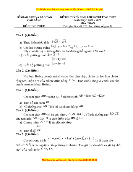 SỞ GIÁO D C Ụ VÀ ĐÀO T O Ạ Đ Ề THI TUY N Ể SINH L P Ớ 10 TRƯ N Ờ G THPT CAO B N Ằ G NĂM H C Ọ 2021 – 2022 Môn: TOÁN Đ C Ề HÍNH TH C Ứ