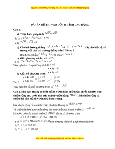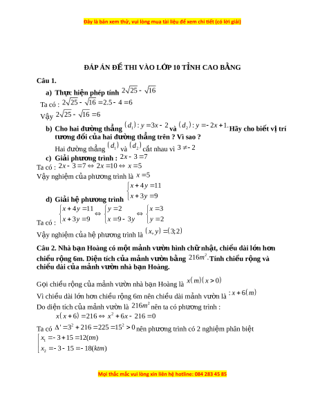 ĐÁP ÁN Đ Ề THI VÀO L P Ớ 10 T N Ỉ H CAO B N Ằ G Câu 1. a) Thực hi n phép t ệ ính 2 25 16 Ta có : 2 25 16 2 .5 4 6 V y ậ 2 25 16 6 b) Cho hai đư ng t ờ h ng ẳ d : y 3 x 2