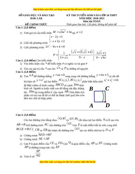 SỞ GIÁO D C Ụ VÀ ĐÀO T O Ạ KỲ THI TUY N Ể SINH VÀO L P Ớ 10 THPT ĐAK LAK NĂM HỌC 2020-2021 Môn thi:TOÁN Đ C Ề HÍNH TH C Ứ Th i