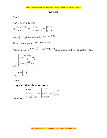 2x 9x 4 0 Phư ng ơ trình có 2 9 4.2.4 4 9 0 nên phư ng ơ trình có hai nghi m ệ phân 9 49 1 x1 4 2 9 49 x 4 2 biệt: 4 1 S ;4 V y ậ 2 Câu 2. 1) Tìm đi u ki ề n và rú ệ t g n P ọ x 0 x 0 x 0 9 x 0 x 9 x 9 4x 36 Đi u ki ề n: ệ 6 4x 0