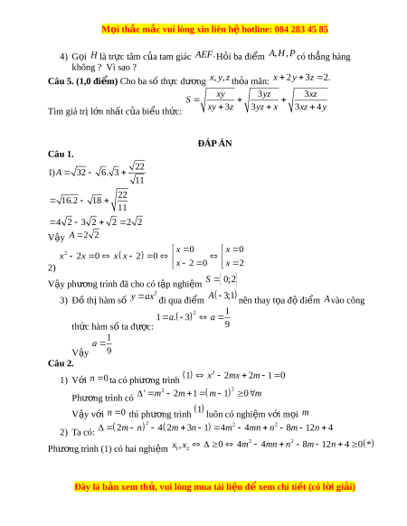 ờ gian làm bài: 120 phút (không k t ể h i ờ gian phát đ ) ề Đ C Ề HÍNH TH C Ứ Câu 1. (2,0 đi m ể ) 22 A 32 6. 3 1) Rút g n bi ọ u t ể h c ứ 11 2) Gi i ả phư ng t ơ rình: 2 x 2x 0 2 3) Xác đ nh h ị s ệ ố a c a ủ hàm số y a x , bi t ế đồ th hàm ị s đi ố qua đi m ể A 3; 1 2 Câu 2. (2,0 đi m ể ) Cho phư ng