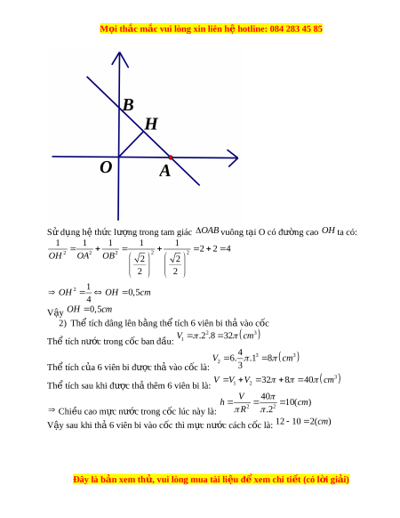 OH OH 0 ,5cm 4 V y ậ OH 0 ,5cm 2) Th t ể ích dâng lên b ng ằ th t ể ích 6 viên bi th vào c ả c ố 2 3 V .2 .8 32 cm Th t ể ích nư c ớ trong c c ban đ ố u: ầ 1 4 3 V 6. .1 8 3 cm 2 Th t ể ích c a 6 vi ủ ên bi đư c t ợ h vào ả c c ố là: 3 3 V V V 32 8 40 cm Th t ể ích sau khi đư c t ợ h t ả 1 2 hêm 6 viên bi là: V 40 h 10 (cm) 2 2 Chi u ề cao m c n ự ư c ớ trong c c l ố úc này là: R .2 V y ậ sau khi th 6 vi ả ên bi vào c c t ố hì m c n ự ư c ớ cách c c l ố à: 12 10 2 (cm)