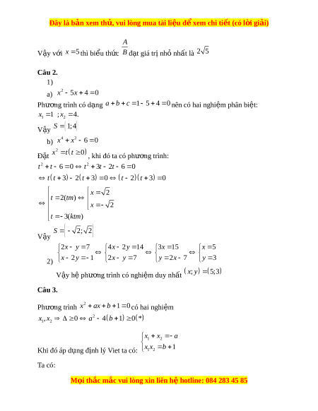 ệ xem ể chi ti t ế (có l i ờ gi i ả ) A V y ậ v i ớ x 5 thì bi u t ể h c ứ B đ t ạ giá tr nh ị nh ỏ t ấ là 2 5 Câu 2. 1) a) 2 x 5x 4 0 Phư ng ơ trình có d ng