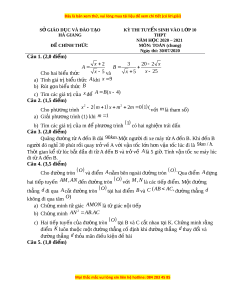 1 x m 2m 0 1 ( v i ớ m là tham số) a) Gi i ả phư ng t ơ rình (1) khi m 1 b) Tìm các giá tr c ị a ủ m đ ph ể ư ng t ơ rình 1 có hai nghiệm trái d u ấ Câu 3. (2,0 đi m ể ) Quãng đư ng t ờ ừ A đ n B ế dài 90k . m M t ộ ngư i ờ đi xe máy từ A đ n B ế . Khi đ n B ế ngư i ờ đó ngh 30 phút ỉ r i ồ quay tr v ở ề A v i ớ v n ậ t c ố l n h ớ n v ơ n ậ t c l ố úc đi là 9km / . h Th i ờ gian k t ể l ừ úc b t ắ đ u đ ầ i từ A đ n B ế và tr v ở ề A là 5 gi . ờ Tính v n t ậ ốc xe máy lúc đi t ừ A đ n B ế . Câu 4. (3,5 đi m ể ) Cho đư ng t ờ ròn O và đi m ể A n m ằ bên ngoài đư ng