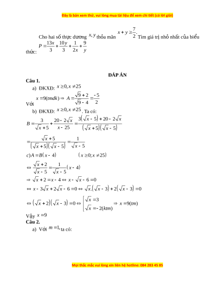7 x y . Cho hai số th c d ự ư ng ơ x, y th a m ỏ ãn 2 Tìm giá tr nh ị nh ỏ t ấ c a bi ủ u ể 13x 10 y 1 9 P th c: ứ 3 3 2x y ĐÁP ÁN Câu 1. a) ĐKXĐ: x 0 , x 2 5 9 2 5 x 9(tmdk) A V i ớ 9 4 2 b) ĐKXĐ: x 0 , x 2 5 . Ta có: 3