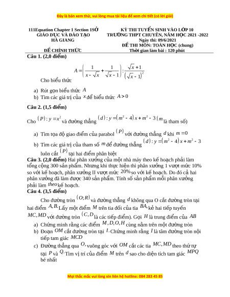 Đề thi vào 10 môn Toán tỉnh Hà Giang năm 2022