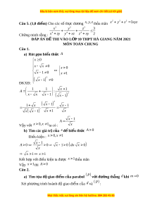 Ớ 10 THPT HÀ GIANG NĂM 2021 MÔN TOÁN CHUNG Câu 1. a) Rút g n bi ọ u t ể h c ứ A x 0 x x 0 x 0 x 1 0 x 1 x 2 1 0 ĐKXĐ: 1 1 x 1 A : x x x 1 x 2 1 x x 2 1 1 x 1 . x x 1 x 1 x x 1 A V y ậ v i ớ x 0, x 1 ta có : x b) Tìm các giá tr c ị a
