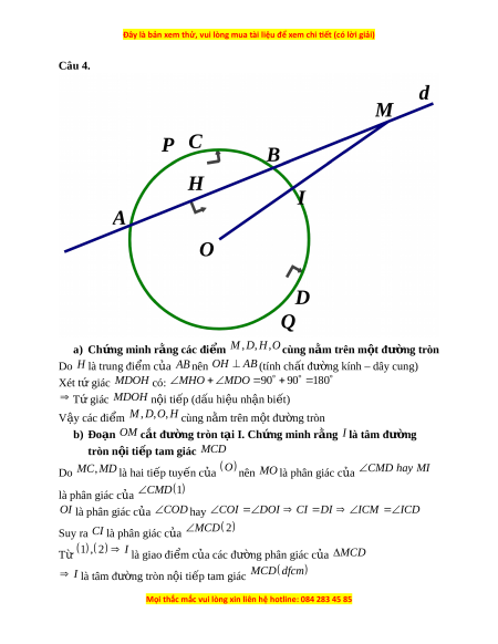 ờ tròn C, D là các ti p đi ế m ể ). G i ọ H là trung đi m ể c a ủ AB a) Ch ng ứ minh r ng các đi ằ m ể M , , D , O H cùng n m ằ trên m t ộ đư ng t ờ ròn b) Đo n ạ OM c t ắ đư ng ờ tròn t i ạ I. Ch ng m ứ inh r ng ằ I là tâm đư ng ờ tròn n i ộ ti p t ế am giác MCD c) Đư ng ờ th ng qua ẳ O, vuông góc v i ớ OM c t