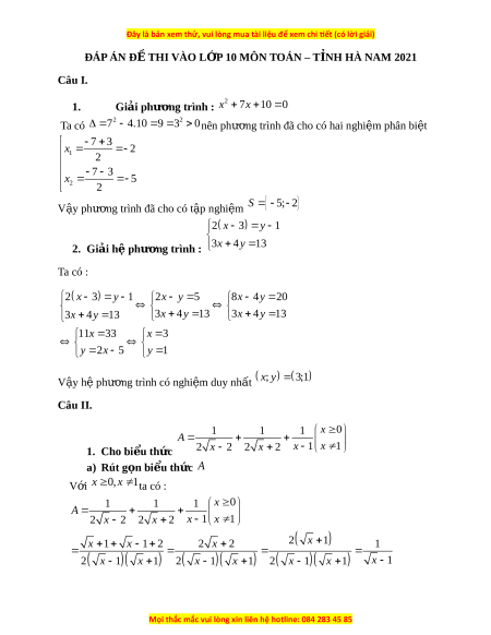 Ớ 10 MÔN TOÁN – T N Ỉ H HÀ NAM 2021 Câu I. 1. Giải phư ng t ơ rình : 2 x 7x 10 0 Ta có 2 2 7 4.10 9 3 0 nên phư ng t ơ rình đã cho có hai nghi m ệ phân bi t ệ 7 3 x 2 1 2 7 3 x 5 2 2 V y ậ phư ng t ơ rình đã cho có t p ậ nghi m ệ S 5; 2