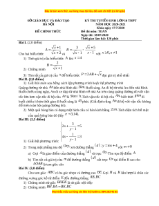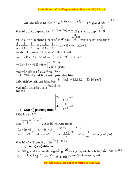 ủ An là 3km / h 2) Tính di n t ệ ích b m ề t ặ qu bó ả ng bàn 2 2 2 S 4 R 4.3 ,14.2 50 ,24 cm Di n t ệ ích b m ề t ặ qu bóng bàn: ả 2 50,24 cm V y ậ di n t ệ ích c n t ầ ìm là Bài III. 3 2x 5 y 1 1 4x 3 1) Giải h p ệ hư ng t ơ rình y 1 Đi u ki ề n : ệ y 1 1 u u 0 Đ t ặ y 1 , ta có hệ phư ng t ơ rình: 7u 7 x 1 2x 3u 5 4x 6u 10 u 3 1 4x u 3 4x u 3 x u 1 1 y 2( tm) 4 y 1 V y ậ h có nghi ệ m ệ duy nh t ấ ; x y 1;2 2) a) Tìm t a đ ọ ộ đi m ể A Vì A là giao đi m ể c a ủ đư ng t ờ h ng ẳ d và tr c ụ Oy nên hoành đ đi ộ m ể A là x 0 A G i