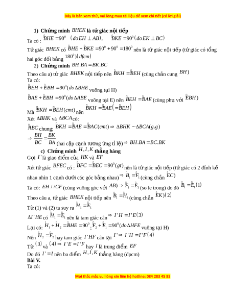 ọ H và K lần lư t ợ là chân các đư ng ờ vuông góc k ẻ t ừ đi m ể E đ n ế đư ng ờ thẳng AB, BC 1) Ch ng ứ minh t ứ giác BHEK là t ứ giác n i ộ ti p ế 2) Ch ng ứ